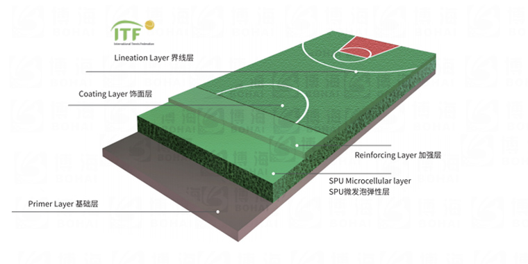 由PU彈性層BH-CS01、加強層和水性面漆耐磨層BH-WB01刮涂組成,該結構具有優越物理性能,滿足人體工學的彈力科技,色彩美觀,施工方便、耐候性能強,防滑性好、容易保養的有點。